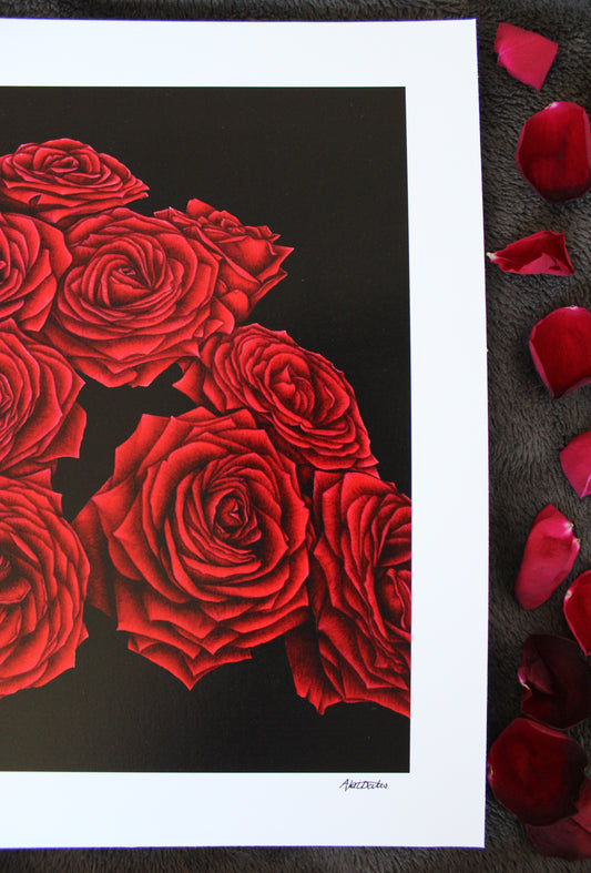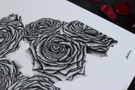 'The Beginning' is a realistic coloured pencil drawing of red roses with a black background. It was Fragile Art's first piece and the idea quickly developed into the first collection. This collection includes two versions of 'The Beginning'; one in coloured pencils, and one in black and white fineliner pen. Limited edition Giclee prints are available of both pieces.