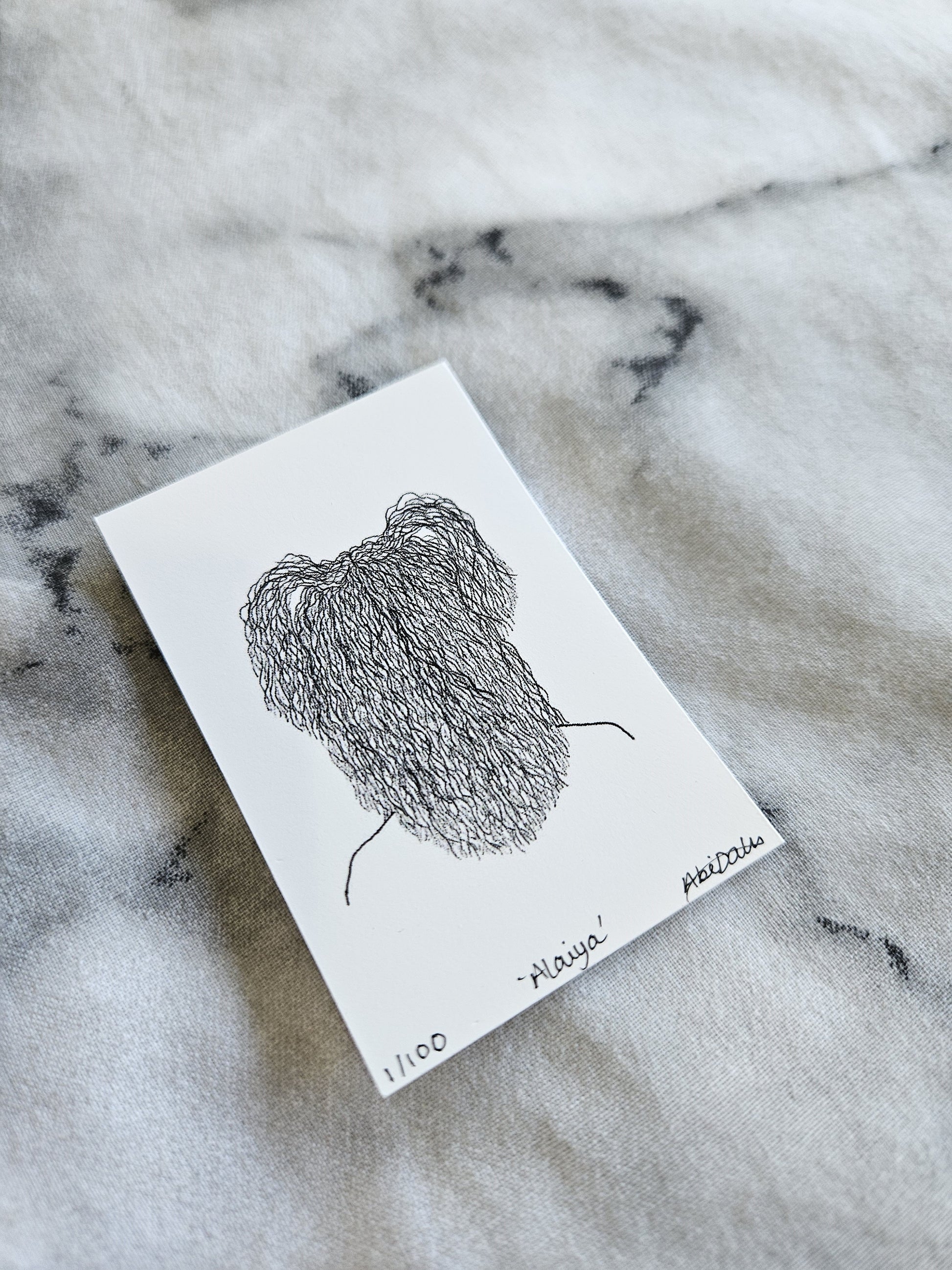 Created from an original artwork titled 'Alaiya', this beautiful giclee print was produced in house here at Fragile Art. Measuring 3 X 2 inches and featuring a long and curly half-up, half-down pigtail hairstyle, the original artwork was hand drawn in pencil and black fine liner as part of our Hair Collection. As one of three pieces celebrating curly hair in this hairstyle, Alaiya is the second piece in the set, with one of the girls having looser curls, and the other having tighter curls.
