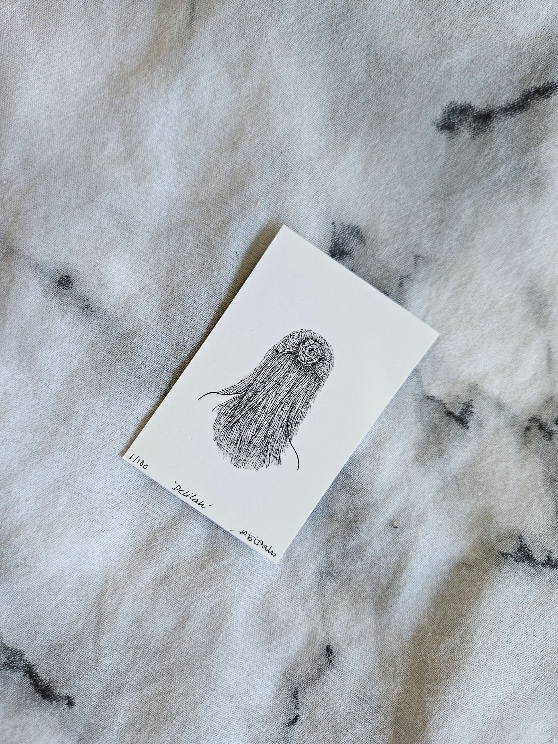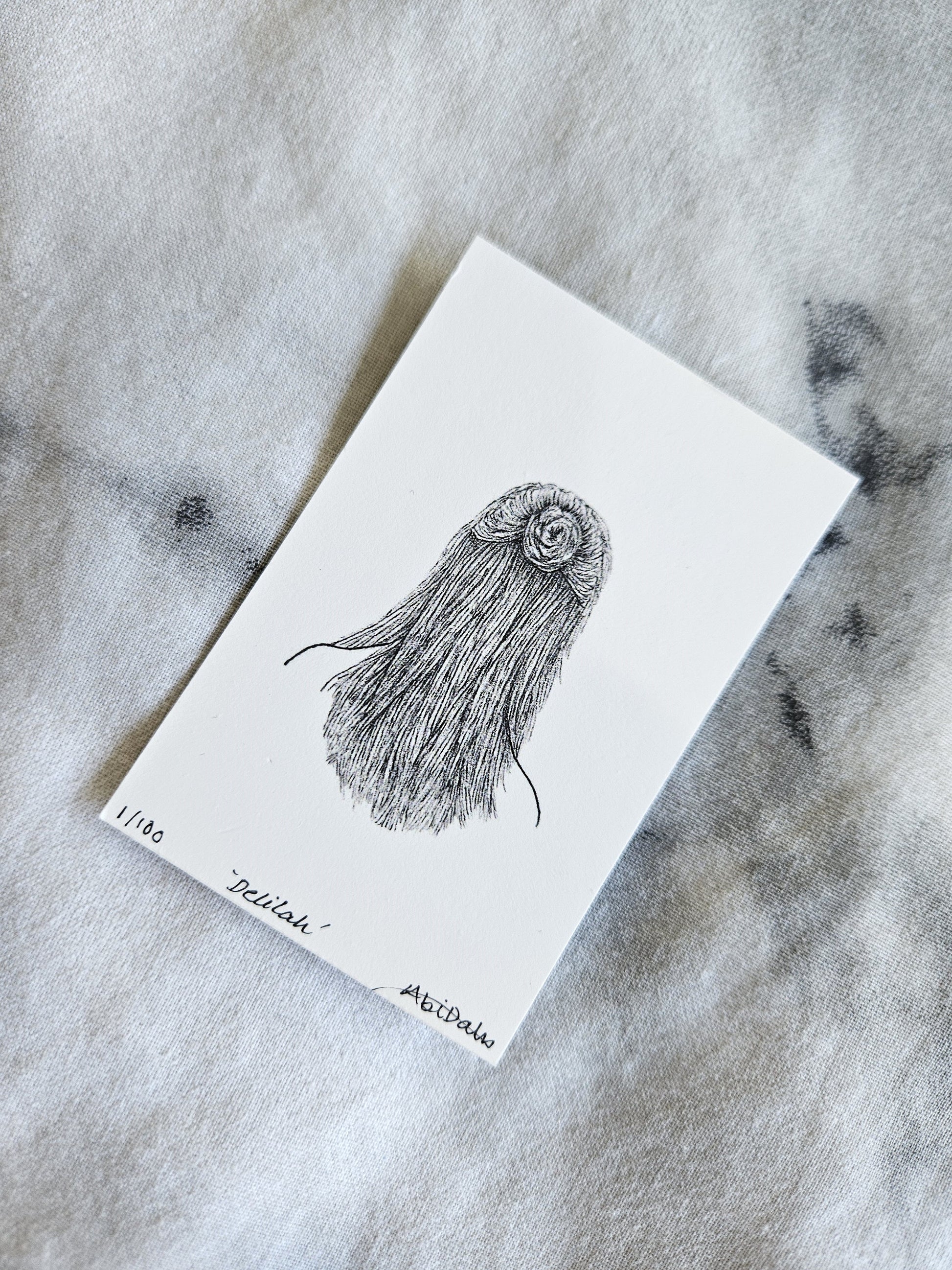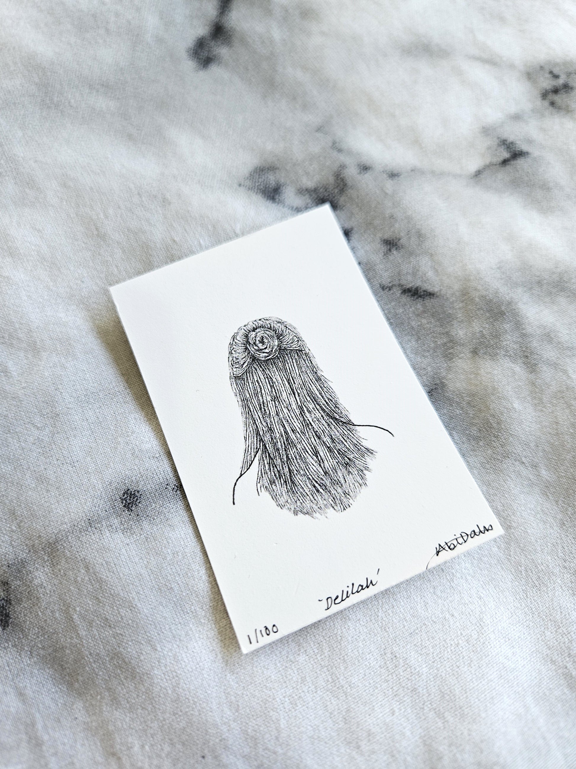 Created from an original artwork titled 'Delilah', this beautiful giclee print was produced in house here at Fragile Art. Measuring 3 X 2 inches and featuring a long straight hairstyle with a half-up, half-down bun, the original artwork was hand drawn in pencil and black fine liner as part of our Hair Collection.